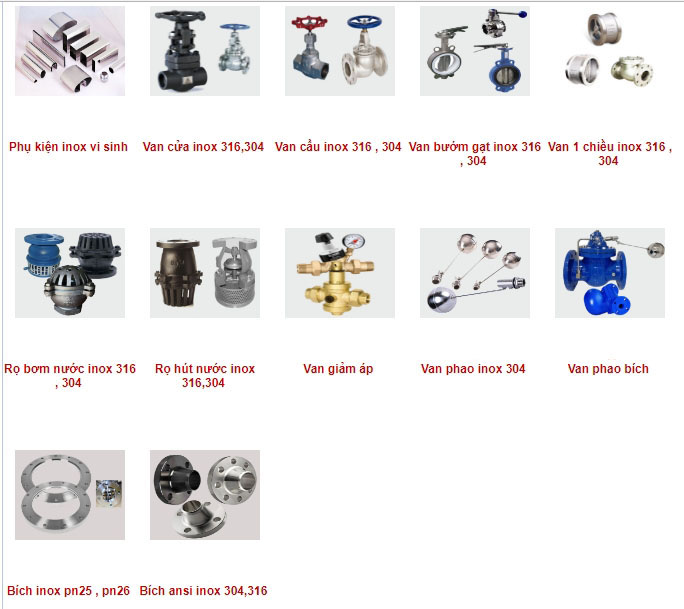 Dòng sản phẩm đợt này bao gồm : van cửa inox , van cầu inox , van bướm gạt inox , van 1 chiều inox 316 , 304 rọ bơm nước inox , rọ hút nước inox , bích inox pn25 , pn26 , bích ansi inox , khớp nối nhanh inox ,măng sông thép , giá đầu phun chữa cháy , bích bs , bích jis , tê đúc class 300 , van giảm áp , van phao inox 304 , van phao bích